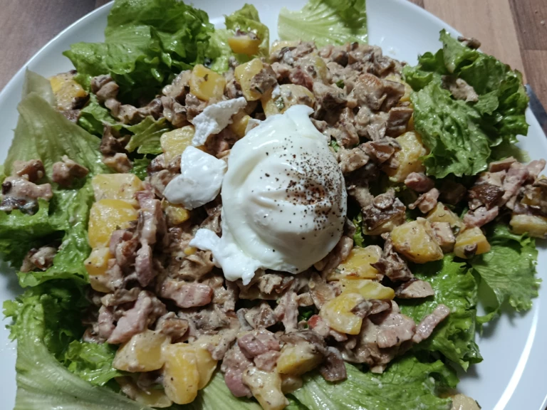 7 - Dans de sgrande assiette, servir la salade, puis la poélée de champignons, et enfin l'oeuf poché par dessus. Bon appétit !