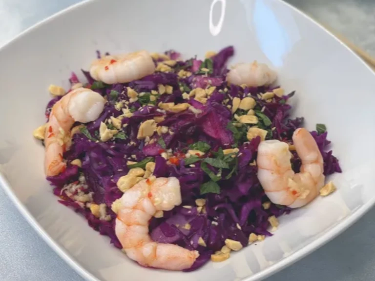 6 - Servez la salade de chou dans les assiettes avec les crevettes (entières ou découpées en tronçons) et parsemées de cachuètes hâchées et de menthe s'il vous en reste.