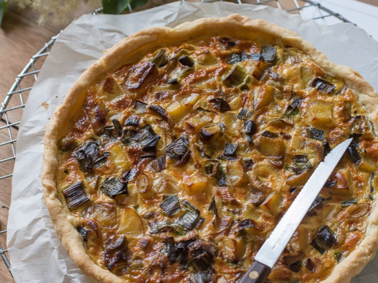 6 - Etalez votre pâte sur du papier sulfurisé dans un moule à tarte et piquez-la à la fouchette. Etalez un fond de moutarde à l'ancienne. Recouvrez du mélange aillet/ oignon/ pommes de terre, puis de l'oeuf battu.