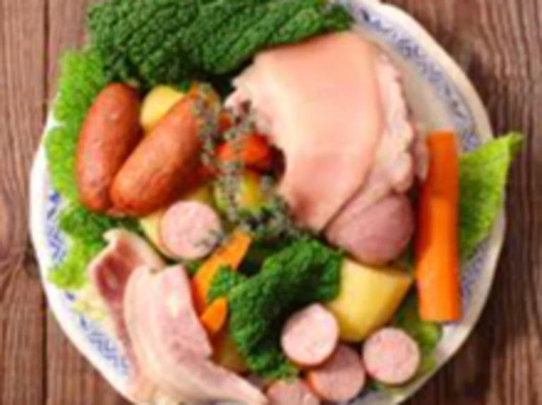 5 - Mettez les légumes dans votre plat à l'exception du chou. Recouvrez-les par la viande coupée et les saucisses, puis par le chou. Poivrez et ajouttez le bouquet garni. Recouvrez d'eau.