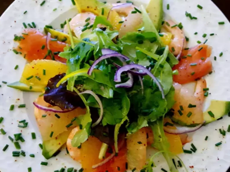 5 - Dans les assiettes, disposez joliment les lamelles de truites fumée, d'avocat et les suprêmes d'agrumes. Ajoutez l'oignon émincé, puis une poignée de salade verte. Arrosez avec la vinaigrette et saupoudrez de ciboulette.